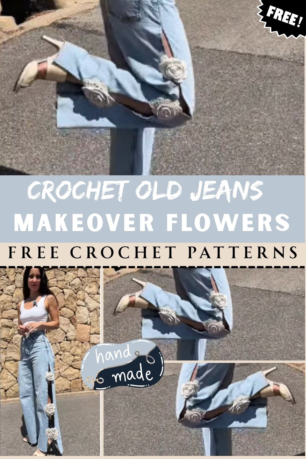 Add sweet crochet flowers to jeans for a cute beginner project. Ideal for covering stains, decorating pockets, gifting, kids’ jeans, y2k/boho styling, and turning plain denim into personalized upcycled jeans with floral appliqué details.